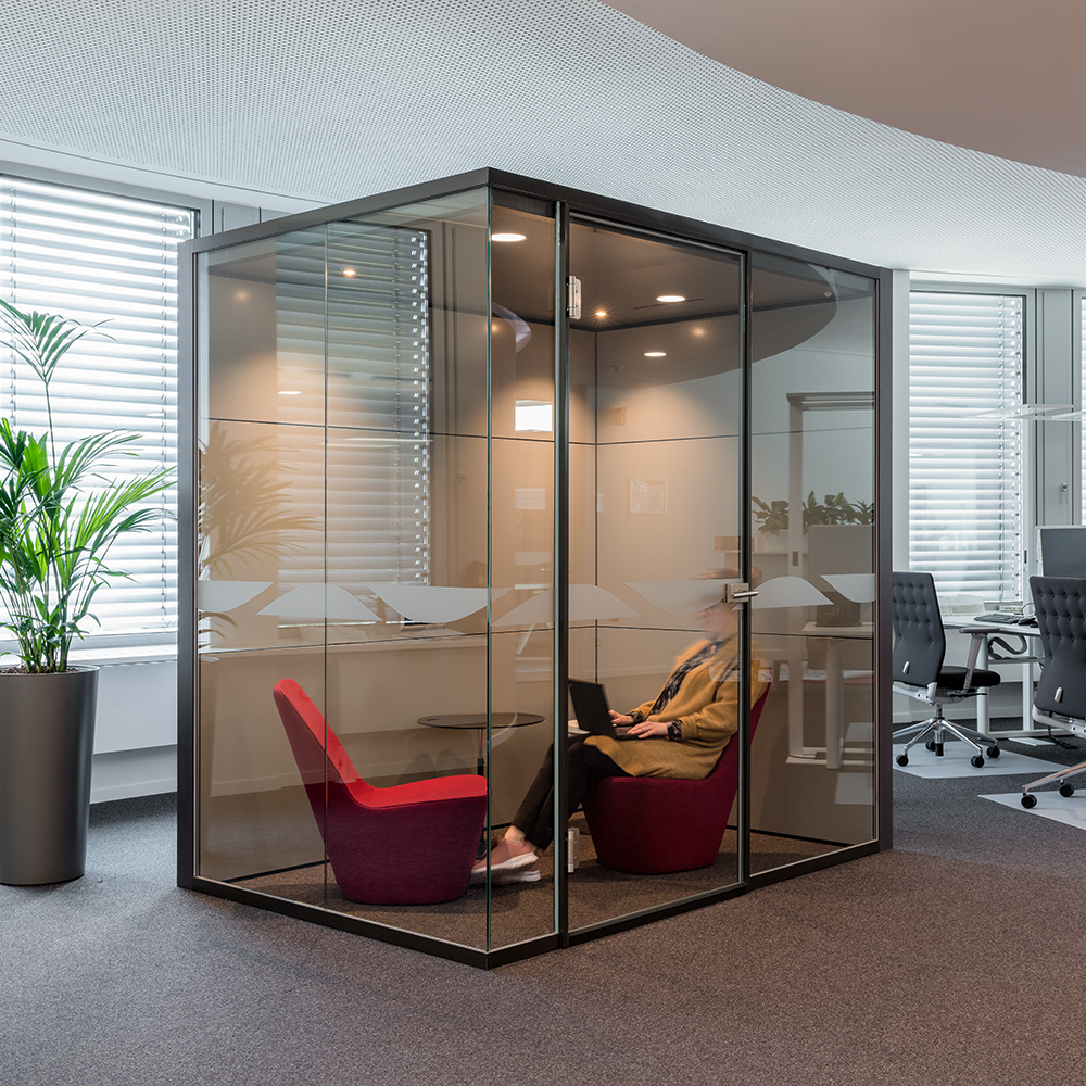 The Kubus II room-in-room system meets the highest standards of aesthetics and functionality. The reduced design with filigree visible widths and flush-fit glazing on the outside enable easy integration into a range of different office space concepts. Excellent sound insulation values thanks to double glazing ensure a working environment for high concentration. Kubus II Plus was awarded the Architecture + Office innovation prize thanks to its perfect combination of design, functionality, quality and technology.