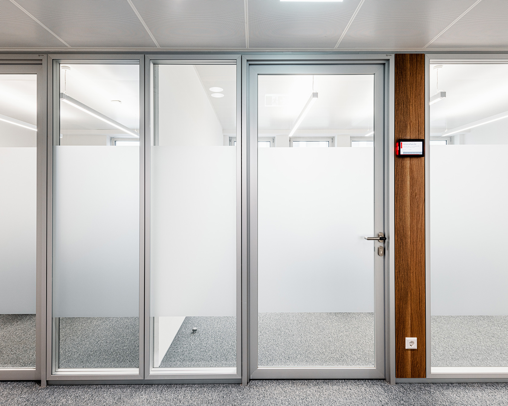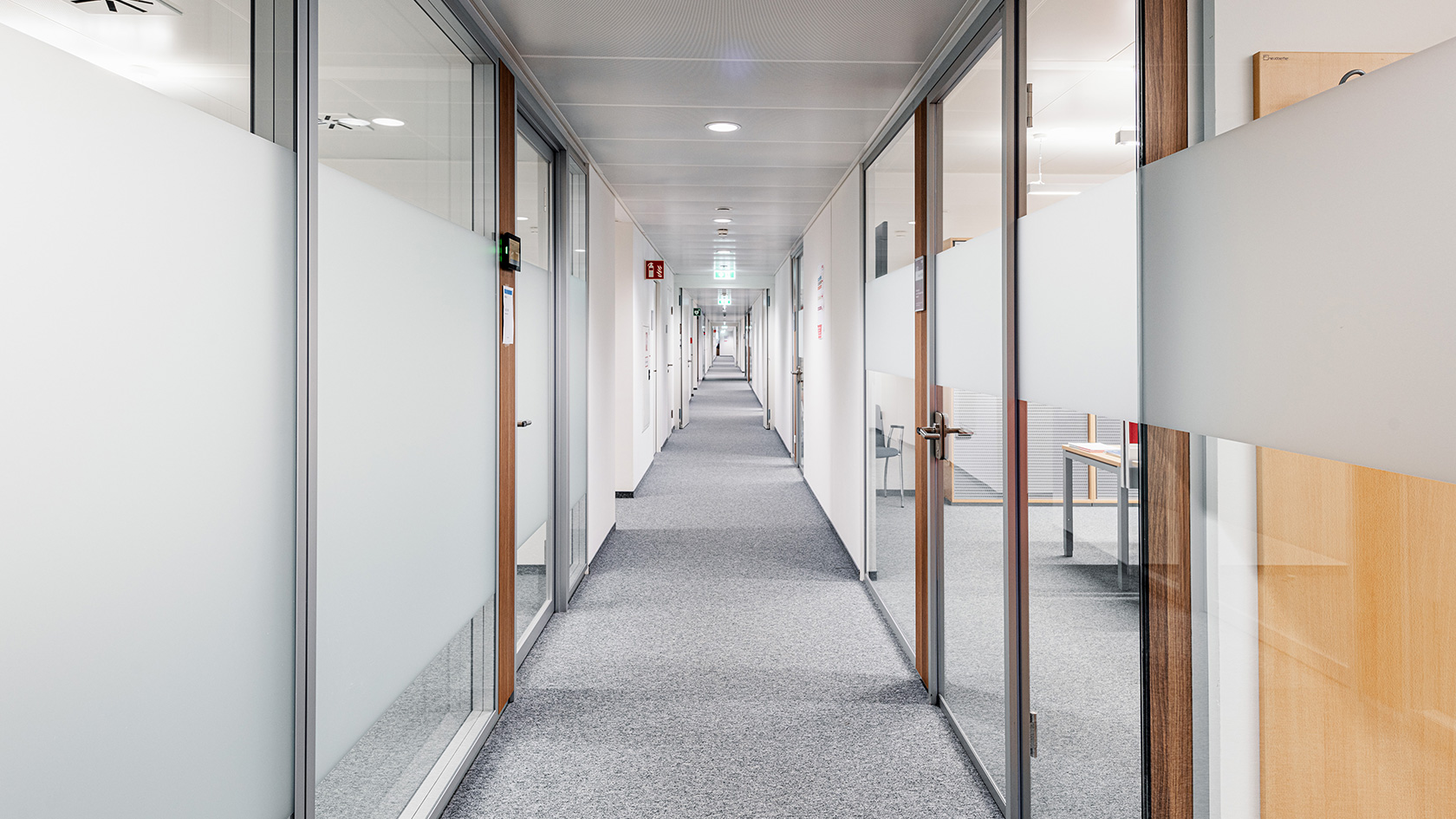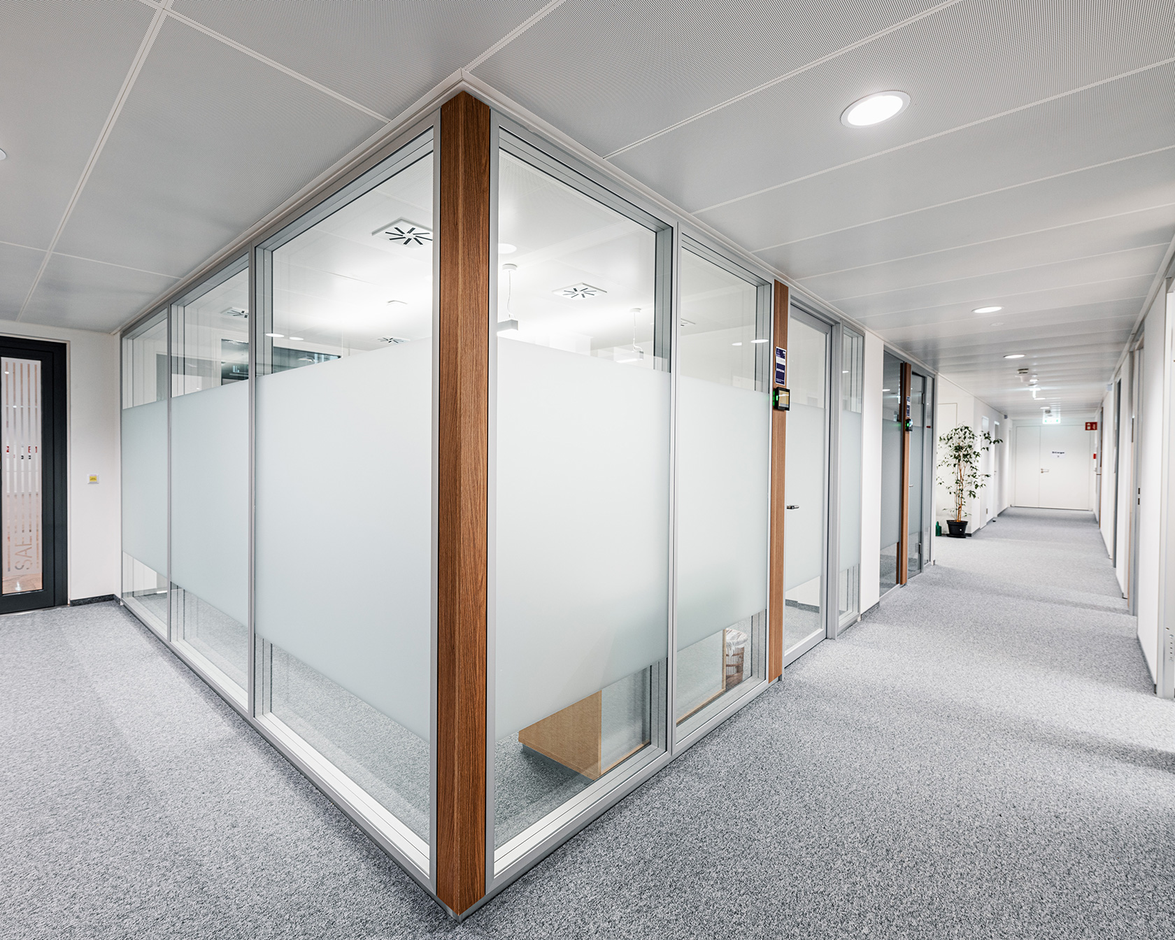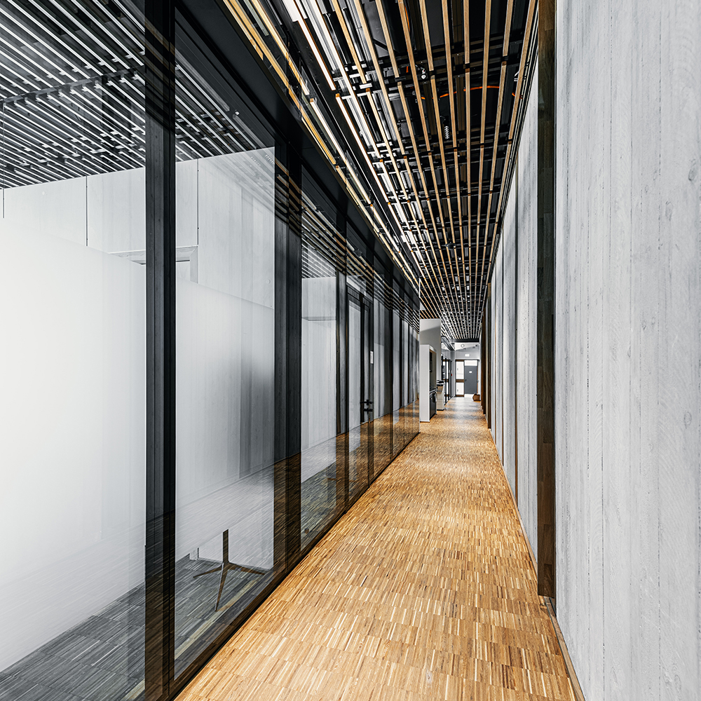 Von Inside wurden für dieses Projekt, verteilt auf sieben Geschoßen, über 3.500 m² Glas verbaut. Zum Einsatz kam unser System Glasline ESG10 mit Nurglastüren sowie das System 2000 mit 40mm Alurahmen-Schallschutztüren in der Oberfläche ALU natur eloxiert. Für farbige Akzente sorgen die verbauten Holzelemente im dunklen Eiche-Dekor.