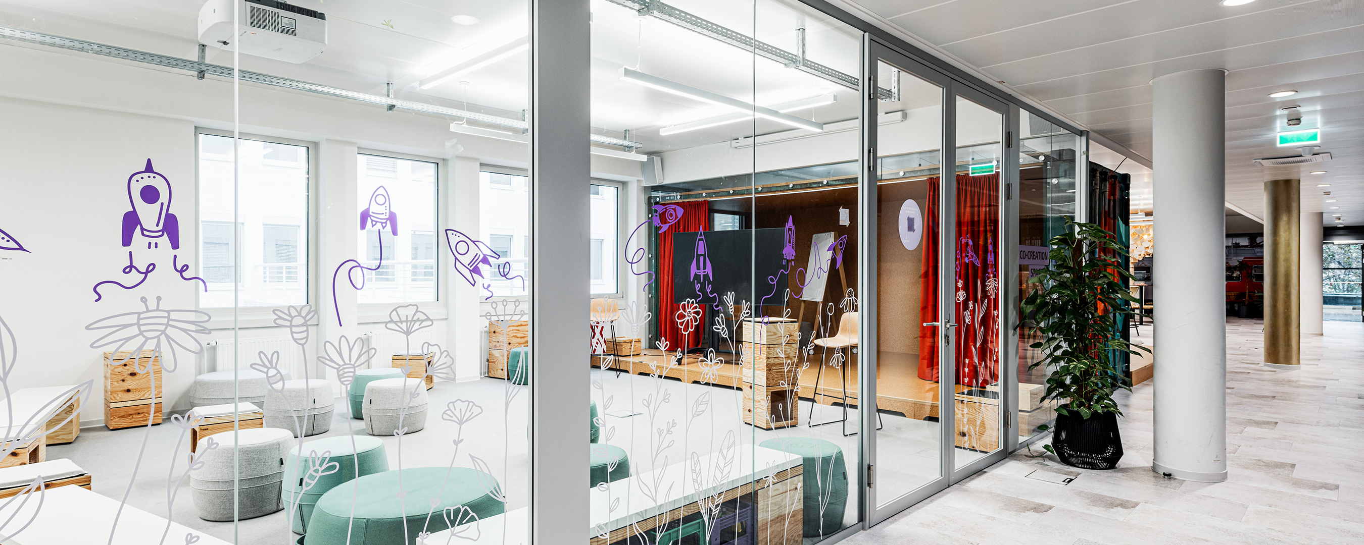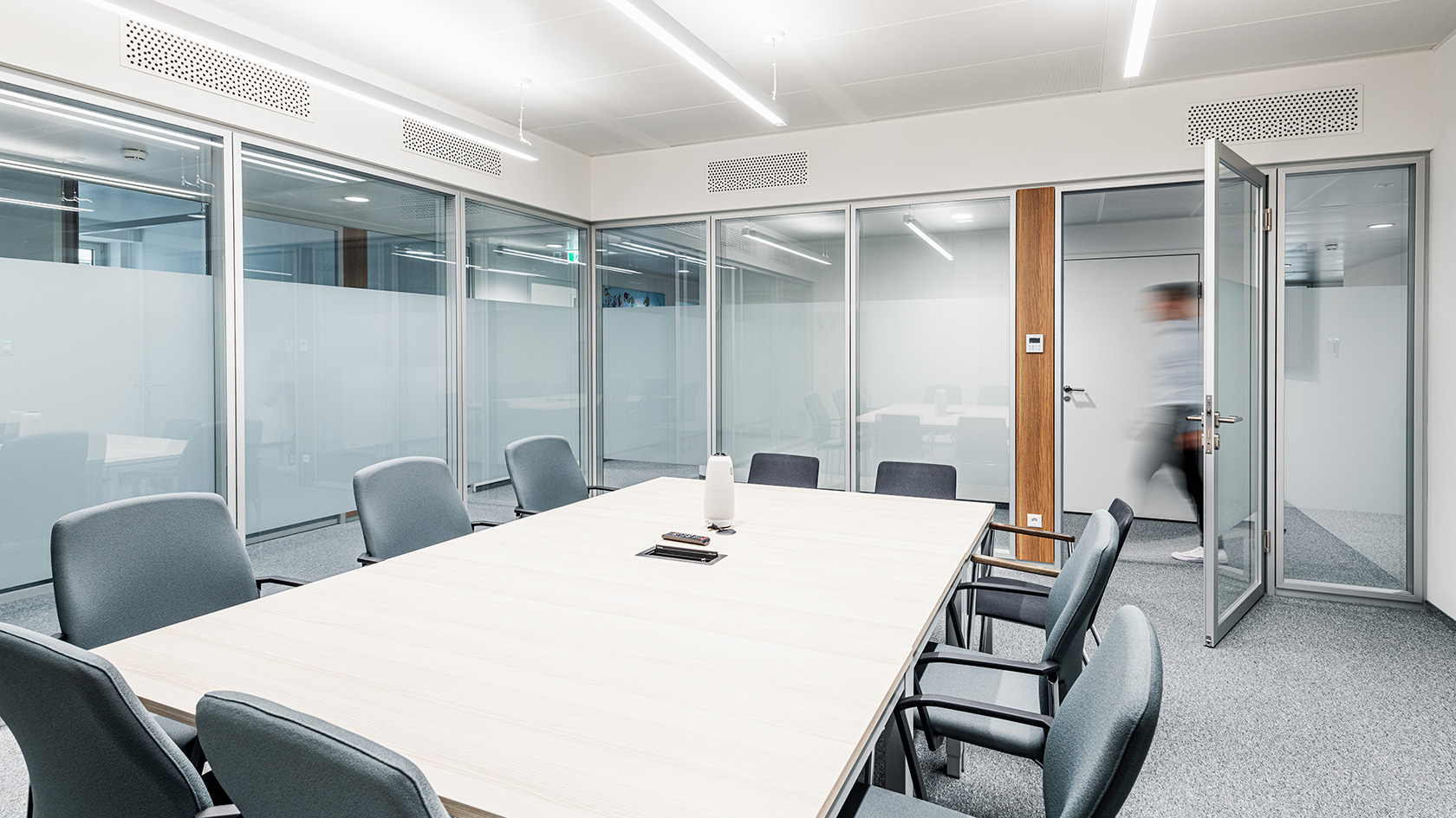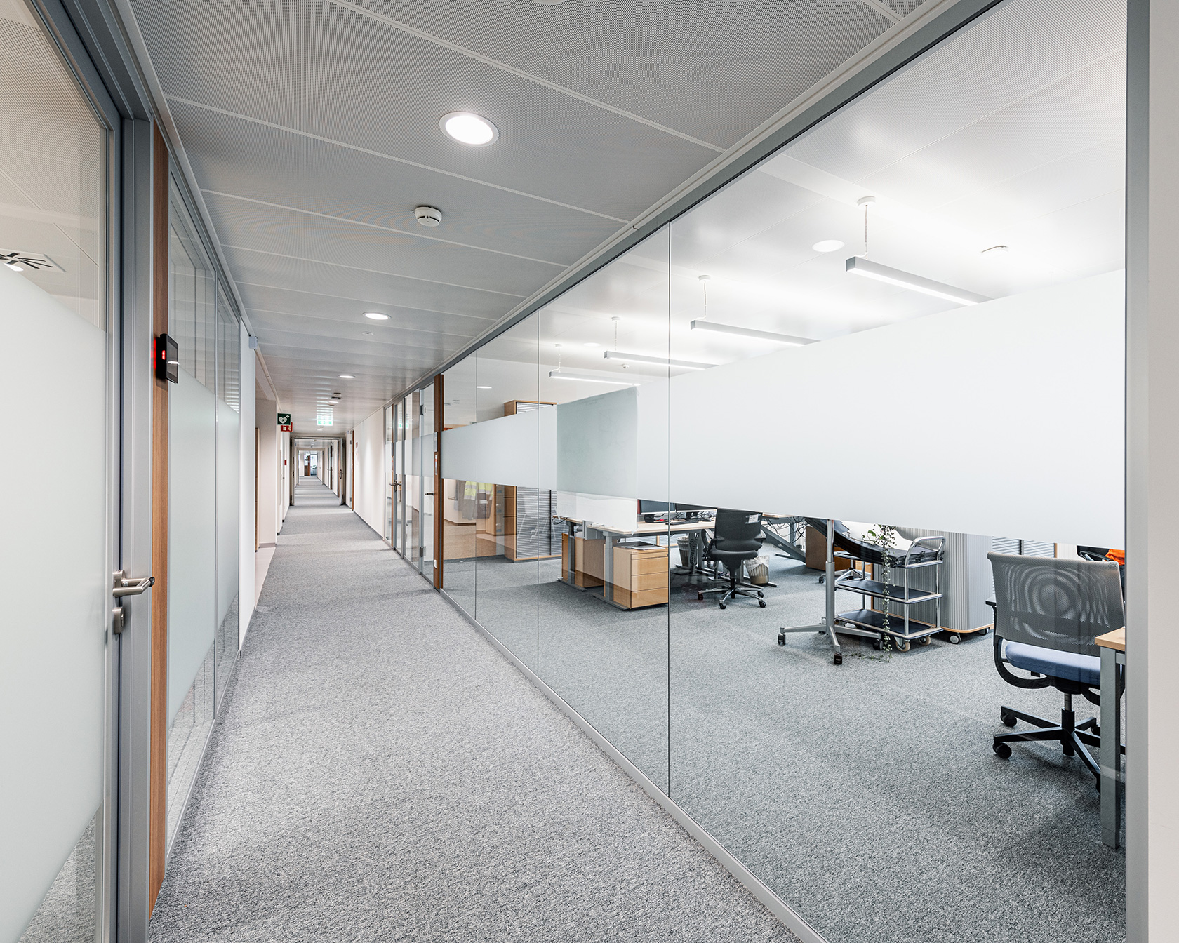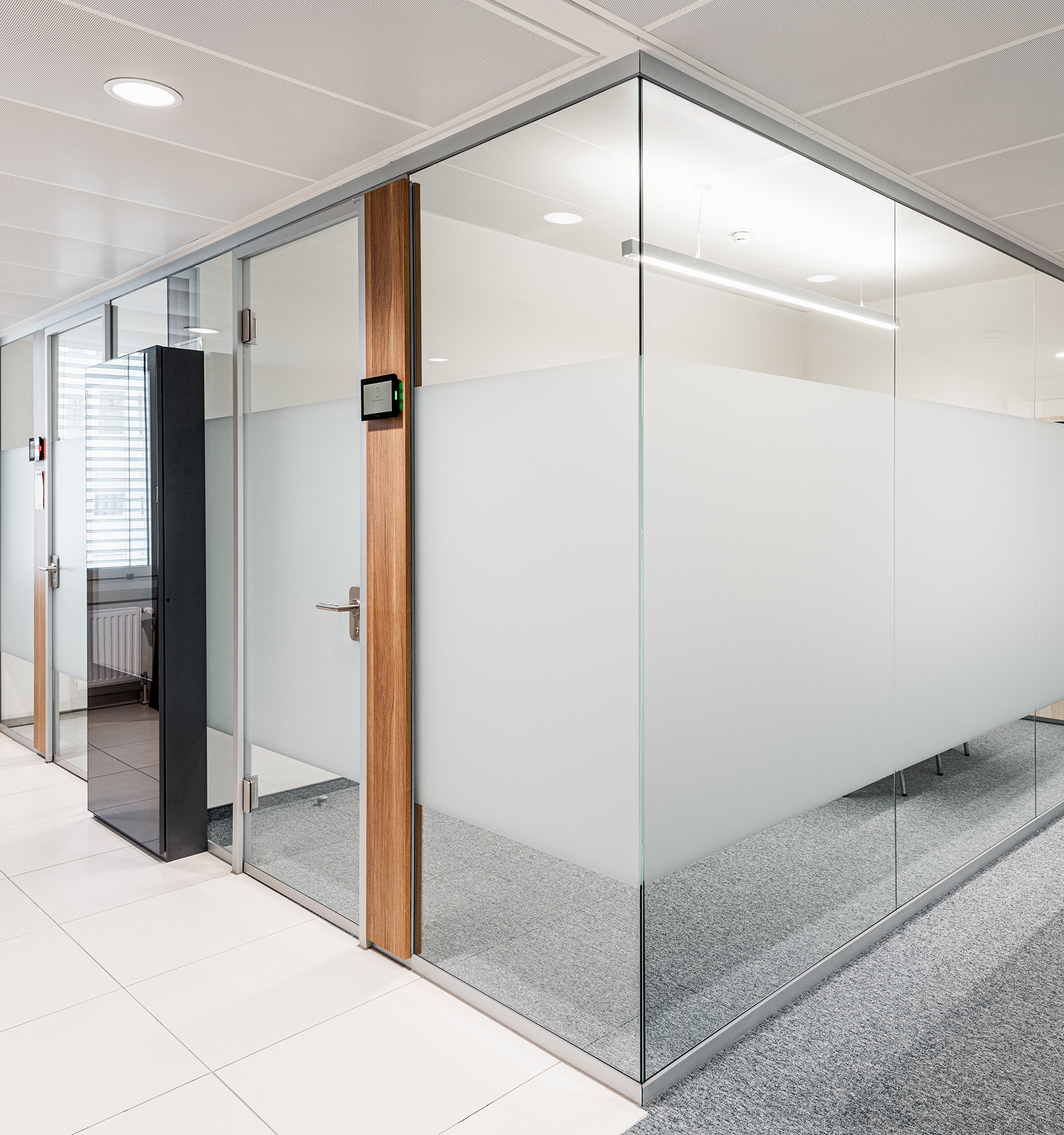 Von Inside wurden für dieses Projekt, verteilt auf sieben Geschoßen, über 3.500 m² Glas verbaut. Zum Einsatz kam unser System Glasline ESG10 mit Nurglastüren sowie das System 2000 mit 40mm Alurahmen-Schallschutztüren in der Oberfläche ALU natur eloxiert. Für farbige Akzente sorgen die verbauten Holzelemente im dunklen Eiche-Dekor.